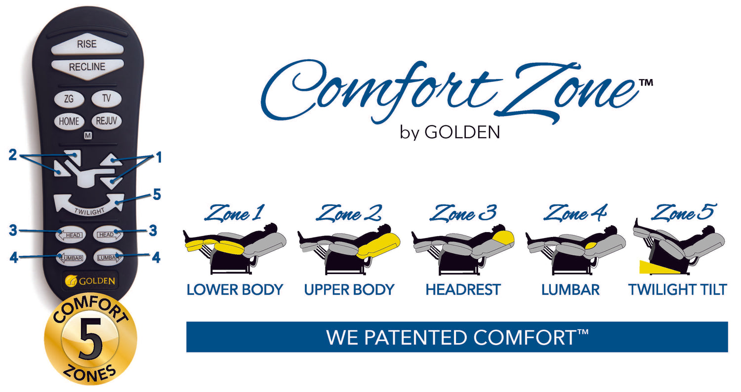 Golden Technologies Comfort Zones provide advanced, adjustable positioning systems in their power lift recliners to enhance comfort and support. Each Comfort Zone targets specific areas of the body, allowing for individualized wellness positioning using the exclusive AutoDrive™ hand control.